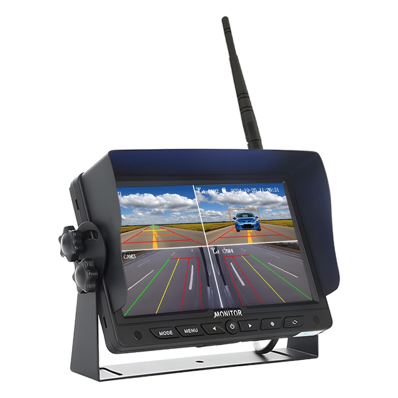Kamera pro sledování řidičů AHD v kabiněBezdrátový monitorovací systém Carleader 7 Inch BSD Blind Spot Detection, digitální bezdrátový kamerový systém integrovaný s funkcí detekce AI, podporuje detekci chodců a vozidel a alarm, varuje řidiče před situací v okolí vozidla. Automatické párování až 4 kanálů bezdrátových kamer 720P, každý kanál podporuje funkci detekce AI. Monitorujte vestavěnou kalibrační nabídku AI pro úpravu velikosti detekční oblasti podle skutečné instalační polohy a úhlu. Monitor Podpora volitelné funkce smyčkového nahrávání, podpora až 256GB úložiště SD karty.