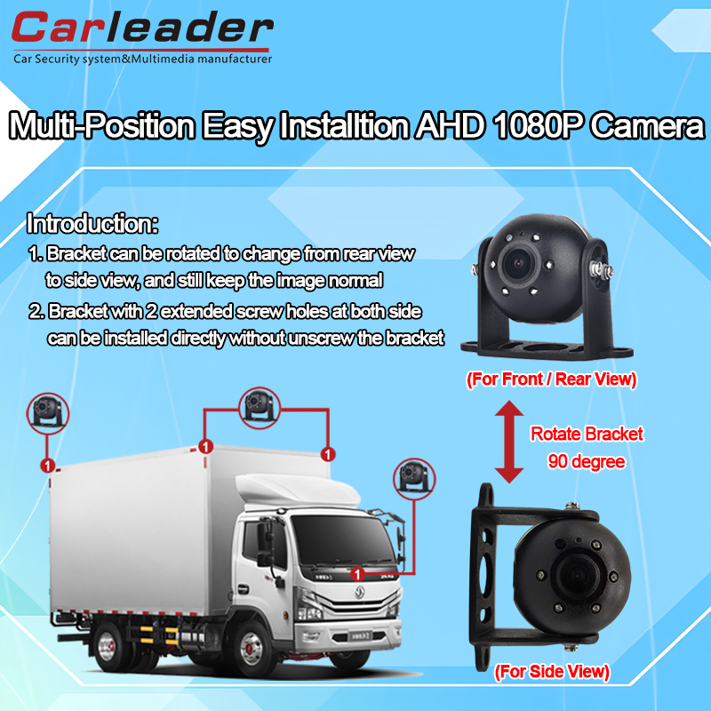 Kamera Carleader AHD Heavy Duty Vehicle Front/Side/Rear View s montážním otvorem držáku nahoře, dole, vpravo, vlevo, který umožňuje kameře nastavit držák kamery tak, aby vyhovovala různým pozicím kamery, jako je výhled zepředu, ze strany a zezadu, díky čemuž je tato kamera kompatibilní se systémem bezpečnostního dohledu vozidla.